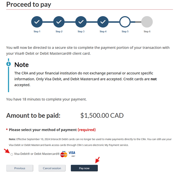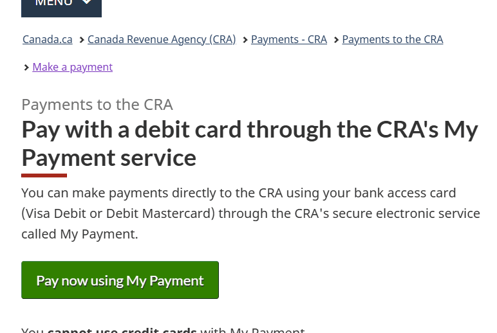 On the payments page, under “One-time payment using CRA online services”, select the Using My Payment link. My Payment is the service that lets you pay with your bank access card. You can then click on Pay now using My Payment