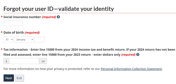 If you’re unable to retrieve your User ID online, call the CRA Individual Enquiries Line: