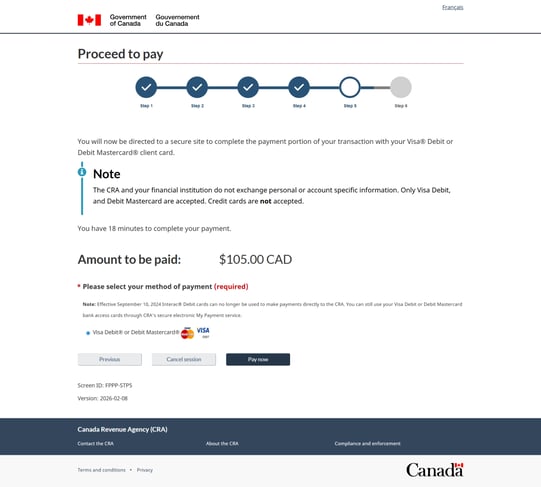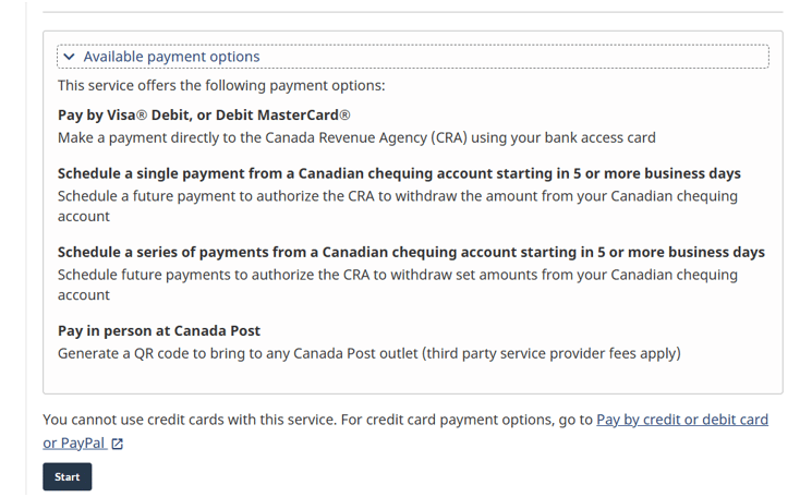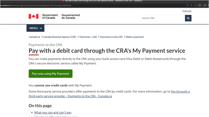 Puedes pagar directamente desde la página del CRA usando débito (Interac o Visa Debit / Debit Mastercard, según disponibilidad del banco):