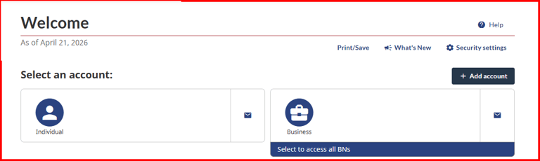 - Ingresa a la cuenta Individual o de Negocio (Business para HST, Payroll, etc): que necesites pagar