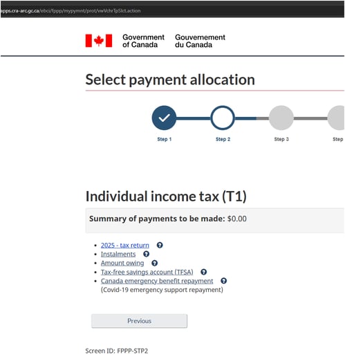 - Selecciona el tipo de pago (ej. Income tax (T1), HST, instalments)